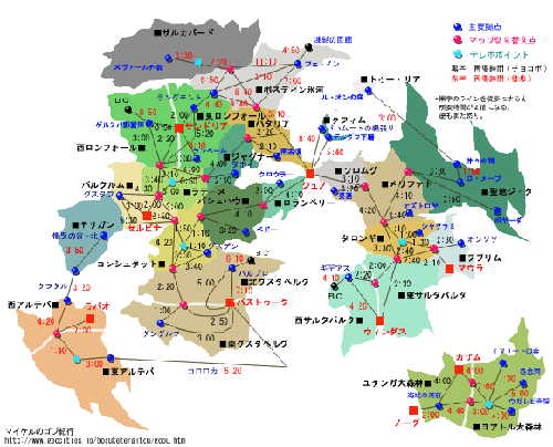 ■ 全国制覇! アイアンハート内藤、世界をゆく! こんにちは。 本当にサポシで狩場へ行ったことがある(管)です。(野良) さて、今回もハッタリな題名で始まったこのコーナー 「FF11の一度はやってみたかった」 ですが、今回は前回までとは違って、データ取りに非常に時間がかかりました。 やってるうちに面倒臭くなって先延ばしにしていた というのが本音だったりして・・・ それはともかく、今回は何をやったかと言いますと ワタクシちょっとアイアンハート親子に影響されましてね(´_ゝ`) 全国を回ってみたんですよ(´_ゝ`) ただ回るだけじゃ面白くないってんでついでに世界地図を作ることしたんですよ。 世界地図なら Lonely Vana'diel さんや エレマップ(特殊?) さん があるじゃないかって? 確かにその通りです。 (管)も非常にお世話になっておりますm(__)m せっかくやるにしても、 同じようなものじゃ2番煎じですしねぇ・・・(ってパクリ?) ココみたいに何かこ〜ヒネクれたサイトには、ヒネクれた世界地図がお似合いだと 思うんですよ。 で、考えました。 マイケルサイトのオリジナル世界地図。 ![]() (みほん:本物は↓に) 全国所要時間マップ。 お父さん!やっちゃったよ!世界初だよこれ!! 誰もこんなアホなことやろうとしなかったから、 世界初なんだねきっと!! というわけで、やっちゃいました 珍地図。 何の役に立つかは、読者様各自で考えて下さい。 それが当面の課題です。 珍地図の設置場所へ行く 戻る |