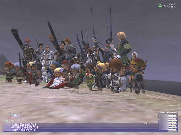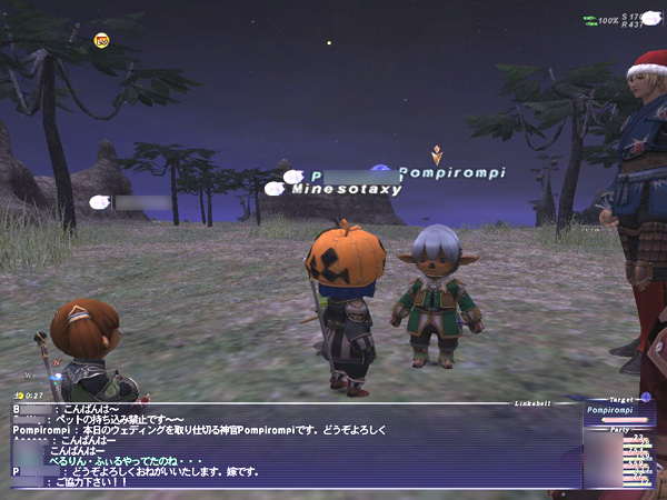 ■Bahamut 鯖 ウィンダス様式/東サルタバルタ隠し海岸 新郎 Dさん 新婦 Pさん / 付添人 Bさん / 星の神官 Pompirompi 他約30名 2005年5月上旬 ![]() ■招待状と派遣特派員 ケース2なので前フリはないよ!! 乙女口調は書いてて虫唾が走るわアアァァァッッ!!! ということで、いつも通りに戻りつつある『THIRTEEN』編集部。 そんな中、バハムートサーバーのPさん(新婦)から 丁寧かつバッファローのごとく ドドドドドドドドドドドド!!! 『結婚式来てぇ!!!』 と、熱心なお誘いがあったら行くきゃっねぇ!! ありがとうメールを送ったところ 返信が。 >密かにだんなしゃん共々勝手に大好きだった(管)さんに参加していただけるなんて、 夫婦でマイケルサイト好きだなんて、それもうかなりダ・・・・・・、 ダ・・・・・・スティンホフマンな方々です・・・。 今回は、結婚式あればどんな所からでも即座に駆けつける、 流しの小型タクシー屋、 ![]() ミネソタクシーが向かいました。 既にツッこみたい方もいらっしゃるとは思いますが、 ここはグッと堪えて、目安BOXに『(管)さん!×××が違います!!』 とか送らないでください。 ◆本編◆ ■いきなりハイテンションの危機 Minesotaxy こと (管) : 『こんばんは、流しのタクシー屋です(´_ゝ`)b』 新婦P : 『ひゃあああ!(管)さん!?』 現れただけで凄い驚きようです! 新婦P : 『わーいぐんにゃりまがったみねそた!』 ![]() *マイケルサイトマスコット うちの『ミネソタ』近影 それってどういうことッ!!? よく分かんないけども! Minesotaxy : 『そうです!!大体そうですッ』 これだけで心が通じ合えるのは、マイケルサイトのいい所です。 集合場所へ。 ![]() うわ、もう人が大勢いるワァ。 カボチャヘッドな新郎新婦&付添人さんと遭遇! さーてと潜入しますk 新婦P: 『はいはいちゅうもーーーく!!』 ?! 新郎D : 『説明して良いのかな?』 あら、別にご紹介など・・・ハズカスィワァ・・・(*´д`*) 新郎D : 『宇宙からやってきた 不思議ロボットタクシーさんです』 Minesotaxy : 『ども^^火星からやってk』 ![]() 誰だァ!!!!! 新婦P : 『ええと、このミネソタしゃんは マイケルのゴブ紀行的なサイト をつくってらっさる管理人さんです。』 いやもうね、ちゃんと説明していただくと、 何だか恥ずかしいわァ(*´д`*) 参列者S : 『なにそれw』 ![]() ![]() マイケルサイトは結構大きくなりましたが、 それでも20〜30人に1人は知ってるか知らないか、な程度なので これが普通です・・・(ノ∀`) ご安心下さい・・・(ノ∀`) そうこうしている間に、時刻は打ち合わせ予定時刻の12時に (新婦P) わーー12じなるー! (新婦P) どっきどっきどっき ちょっと新婦さんは緊張しているようです! 【コンクェストの集計を開始しました。】 新郎D :/sh 『バスーーー!!!!!!!!! 一位たのむーー!!』 アンタアァァァ!!! それは後!!それは後で!! ![]() ポンさま登場 Pompirompi : 『本日のウェディングを取り仕切る神官Pompirompiです。どうぞよろしく』 今日のポンさまは少々マジメな模様。 ■あかるい牢獄 今回は前回の失敗を活かして、何とか星の神官 ポンさまPTに入れてもらえるように交渉しました。 通常は特別に言わないと、新郎新婦・付添人PTには入れてもらえません。 前回はちょっと難航したので、今回も難航しそうです・・・ ポンさま!そこんとこなんとかならないでしょうかッ!? Pompirompi>> 『わかりましたー』 それでいいのかッ!! ![]() === Area: Mordion Gaol === ここからは打ち合わせなので、ミネソタクシーは聞いてるだけです。 何となく各人のサチコメを見たり、 新婦P (? ? ?): 『【男】【女】【ミッション】【ほんきだせ】 今夜1時っ (管)さま、ありがとうございます。 わたくしがPでございます。』 気合入ってます! 新郎D (? ? ?): 『本日〜〜【東サルタバルタ】 集合は0時で! 取材はいります!楽しく行きましょ(´∀`) ウホwウホホwウホホホw?』 モンキー入ってます! 付添人B (? ? ?): 『女の幸福、男の墓場‥‥‥ ヴァナ婚in【東サルタバルタ】』 ウイスキーの広告かアァァァア!!! 打ち合わせは続き・・・ ![]() Pompirompi は新婦Pへウェディングドレス一式を手渡した 新婦P はしっかりうけとった! Pompirompi : 『4個ちゃんとあるか、確認してくださいです』 (新郎D) なくすなよー 新婦P : 『よんこ、あるです〜〜』 (新婦P) うん、なくさない!! (Minesotaxy) もうなくしちゃだめですよ(;゜д゜) Pompirompi : はいです。では、今お渡ししたリングとドレスについて、となりますが、 (新郎D) お母さん縫って上げませんからね! (新婦P) もう、なくすのは…いや…っ (Minesotaxy) なんの小ネタだアァァ 二人ともボケなのかッ!? しかし、ツッコミがいはあります。 Pompirompi : 『まず、ここから戻った後、リングは身につけてもらうタイミングがあり、』 (新郎D) (このつっこみ…本物だ…まちがいなひ…) Pompirompi : 『式本番の指輪の場面にて、となります。それまでは、』 (新婦P) 感動的ダワー! ポンさまの話聞いてるかアァァァッ!!?? そしてウェディングドレス受け渡し。 すぐに着てみたくなるのが新婦の常。 ![]() 新婦P 