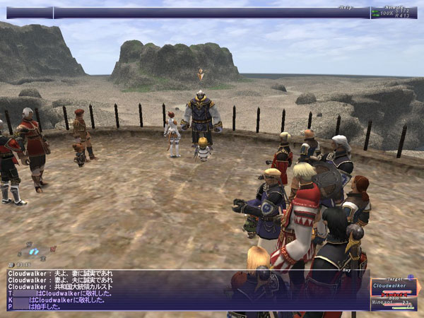 ■Valefor 鯖 バストゥーク様式/南グスタベルグ モルヒェン灯台屋上 新郎 Tさん 新婦 Kさん / 付添人 Aさん / 戸籍官 Cloudwalker 他40名超 2005年6月中旬 ![]() ■ついにバス式が!? ウェディングシリーズもついに6回目ですよ! 結婚式参列も7回目で、ヴァナ内で一番参列しているプレーヤーなのではないでしょうか('-';;) 4月末にウェディング募集してみたものの、それほどお誘いは来ないんではないか? とタカを括ってたところ、このたった2ヶ月で10件ほどお呼びがかかりまして マイコーサイトって意外に見られてるなー(;゜д゜)と驚いていた次第であります。 しかし! その中でバス式はなぜか1件もありませんでした! うーん、このままではバス式を拝まずにこの企画が終了してしまうぞ!! と危機感を抱いていたところ・・・・・・ >8鯖の[新婦]Kといいます。 >今度バス灯台で結婚式をする予定です。 >日時は6月--日(-)21:00〜です。 >もしよろしかったら、ぜひいらしてください m( __ __ )m >今度バス灯台で結婚式をする予定です。 >今度バス灯台で結婚式をする予定です。 ![]() ??? スケジュール的にも最適だし、 これは行くきゃないぜ!!!! ◆本編 ■ヨダレを拭いて。 さて、今回の新郎新婦は ![]() この方。 今回は新婦Kさんから自己紹介も頂いたので、ちょっとご紹介しましょう。 −−−−−−−−−−−−−−−−−−−−−−−−−−−−−−−−−− 新郎:Tさん 主にやってることは釣りで92です。あと、錬金が87です。 樽で不向きなはずの前衛をやるのがイイのだそうで…マゾかもしれません(* ̄m ̄) −−−−−−−−−−−−−−−−−−−−−−−−−−−−−−−−−− 釣り92ですか(゜д゜)!すごいですねー! (管)なんか6ですよ!あまりに微妙!! −−−−−−−−−−−−−−−−−−−−−−−−−−−−−−−−−− 新婦:Kさん メインジョブはシフ30台です。 …始めて2年以上経つはずなのですがw 主にやってることは木こり、草刈り、木工上げ、「チャット」です。 殴られて痛いのは嫌いだし、おもしろスキルがあるのがやりたかったのでシフがやり たかったんですが、 彼にどの種族がシフに適してるか聞いたところ、ミスラだったのでそれになりますた (* ̄∀ ̄)b −−−−−−−−−−−−−−−−−−−−−−−−−−−−−−−−−− 2年で30台とはかなりマッタリペースですな(´―`) あら、今回のお二人はもしかして・・・? とりあえず先に進みましょう。 新郎T : 今日は人が異様に多そうです 新婦K : 50人にならないといいねぇw 50!!!?? 今までの最高が30ちょいだったので、 それよりも遥かに多いことになります。 ゴミムシも参列してきたようです。 付添人A : たたきつぶせ〜 さっそく死者(?)でますから!!! 新郎T : ティッシュで優しく包んで捨てた ![]() 思いやり?なのかどうかは知りませんが、叩き潰すより 思いやった感じです。 そういえば戸籍官Cloudwalker氏(バス式の神父)はまだ来ないの・・・? ![]() ![]() これがバス様式の結婚式を取り仕切る、Cloudwalker氏です。 ティッシュの中から現れました。 ![]() メシは後!!!メシは後で!!!! ![]() 新郎T : 戸籍官さんって呼ぶの大変だなぁ たしかに長いしカタイですね。 親しみ易い呼び方は・・・・・・。 ![]() どこに遠慮した。 新郎T : じゃぁKuraudoさんで('∇') それは遠慮してください。 不敵に笑いながらも、打ち合わせスタートです。 ![]() Cloudwalker : では、皆さんこの塔をよじ登ってください Cloudwalker : では気合い入れてくださいよ! いきなりミッションインポッシボーな!! 新郎T : わーいわーい H : おうよ兄弟! 新婦K : うははw Minesotanker : センセェェ!! 付添人A : 先生!のぼれませーん! ![]() 気合で登っちゃいました。 ![]() 外観ではこんな感じです。 (*今回は、LSやPTを組まないでSayでワイワイやりたいという方針でしたので、 PTには入りませんでした。) Cloudwalker : では、付添い人さん 付添人A : はぃ Cloudwalker : 後ほど参列者の方の整列をお願いするのですが、 Cloudwalker : あの階段から、ここまでの両脇にバージンロードが出来るように整列をお願いします Cloudwalker : 新郎さんと新婦さんが心地よく入場できますよう、 Cloudwalker : 付添い人さんのセンスにお任せします 付添人A : !!!!!(*´д`*)!!!!! Cloudwalker : 我がバストゥークは細かいことは気にしませんので、 バス式は他とは違い、アバウトが基本なようです。 付添い人さんに全権委譲です。 新郎T : Kuraudoさん、実は参加者が大勢になってしまいまして… Cloudwalker : わたしは、Cloudwalkerですよ! Cloudwalkerは新郎Tをバシッとたたいた。 新郎T : ごめんちゃい(´_ゝ`) 新郎はちっとも反省していません。 kuraudoってアナタ・・・そのまんまじゃないすか・・・ ![]() ウィーーン ![]() ティキーン 超級結婚式破談。 Cloudwalker : ではでは、他に無ければ、本格的な打ち合わせの為に別の場所へ移動しましょう とりあえず生き残ったようです。 皆さんはモルディオンへ(´―`)ノシ さてさて。 モルディオンに行かない場合は、中の様子を窺い知ることが出来ないので、 参列者側