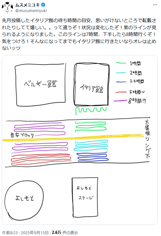 イタリア館は11時に列に並んだら5時間以上待ちだった、などの報告があり、おそるべき状態になっていた・・・