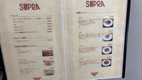 レストランはトルクメニスタンの伝統的な料理が食べられるらしいが、東京でもトルクメニスタン専門料理屋は見たことないので、レア度は相当に高いと思われる。