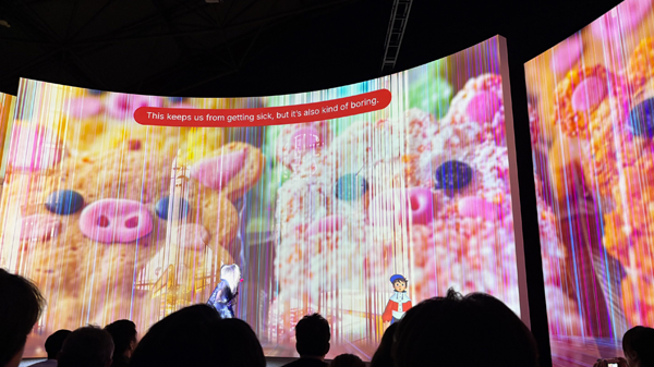 ここではスマホを使い、会場参加型で望む未来を選択するという仕掛け。お姉さんがガイドしてくれるが、選択肢は意外と悩ましく、票も結構割れる。