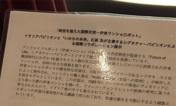 実は他パビリオンとのコラボで「伊藤マンショロボット」とのこと。普通の美術館では見られないような 仕掛けがあるのは万博ならではですね。