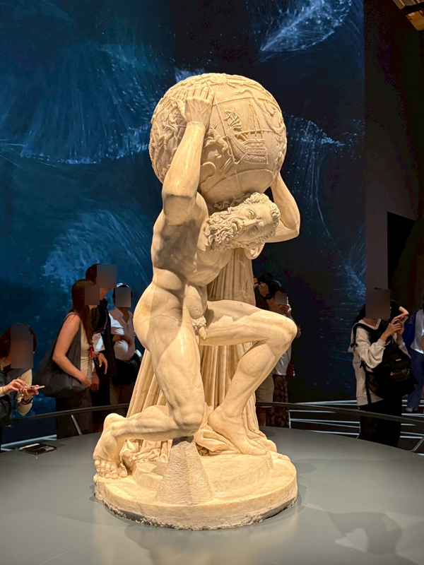 中央に鎮座するのは紀元2世紀ごろに作られたという「ファルネーゼのアトラス」。 ギリシャ神話の巨神アトラスが天球を肩に担いでいる大理石の彫刻ですが、アジアでは日本が初公開ということで イタリア館の顔となってます。