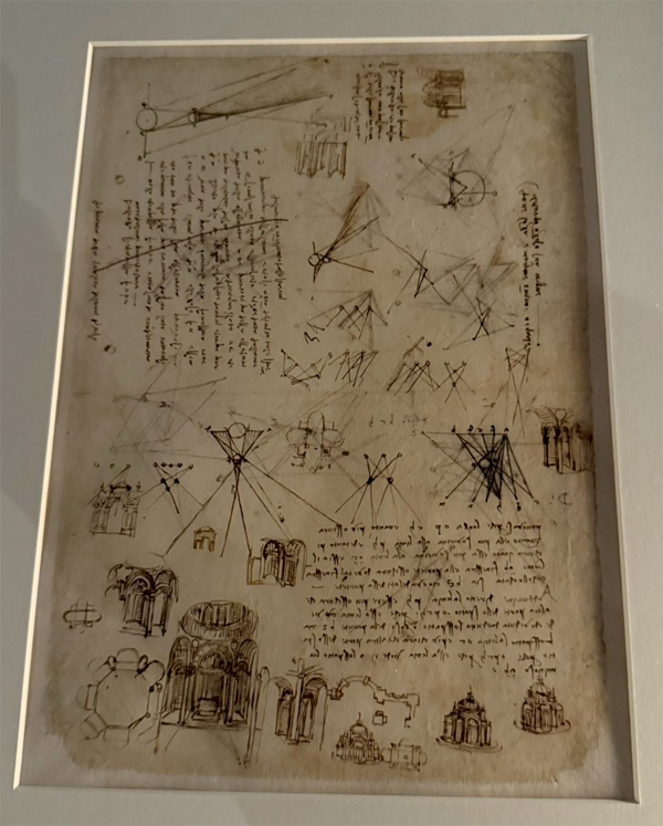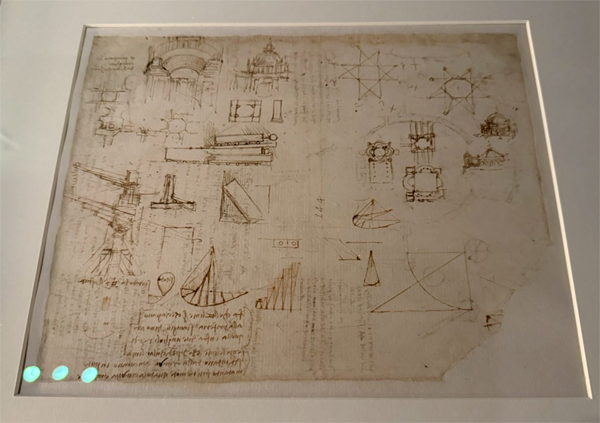警備員さんが絶対にフラッシュを炊いてはならぬと目を光らせていた、 レオナルド・ダ・ヴィンチの「アトランティックコード」。 文書やスケッチのコレクションで、これは光と影を学ぶために描いたスケッチ。