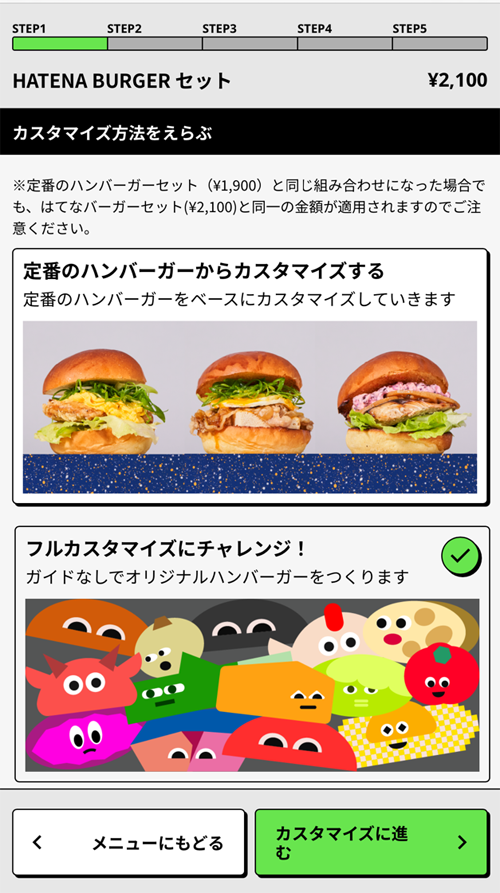ここの目玉はカスタマイズできるバーガーで。あまり極端なことはできないが、バンズ、具、ソースを組み合わせることができる。